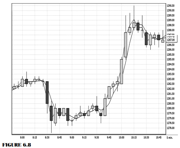 6.8 shows a five-minute chart on the e-mini-S&P 500 futures. In the preopen