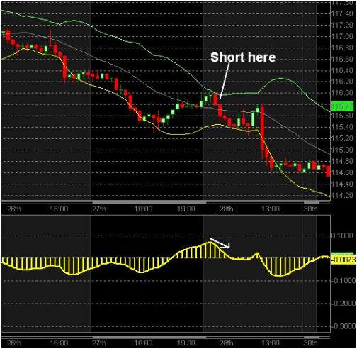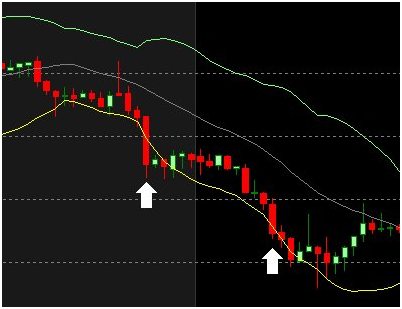 1 shows an hourly chart of USD/JPY, with the green band as the upper Bollinger