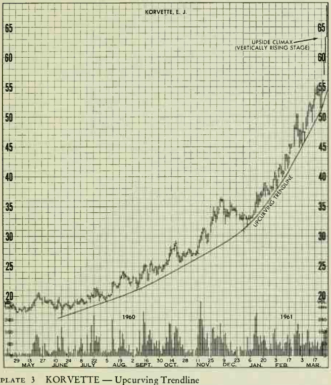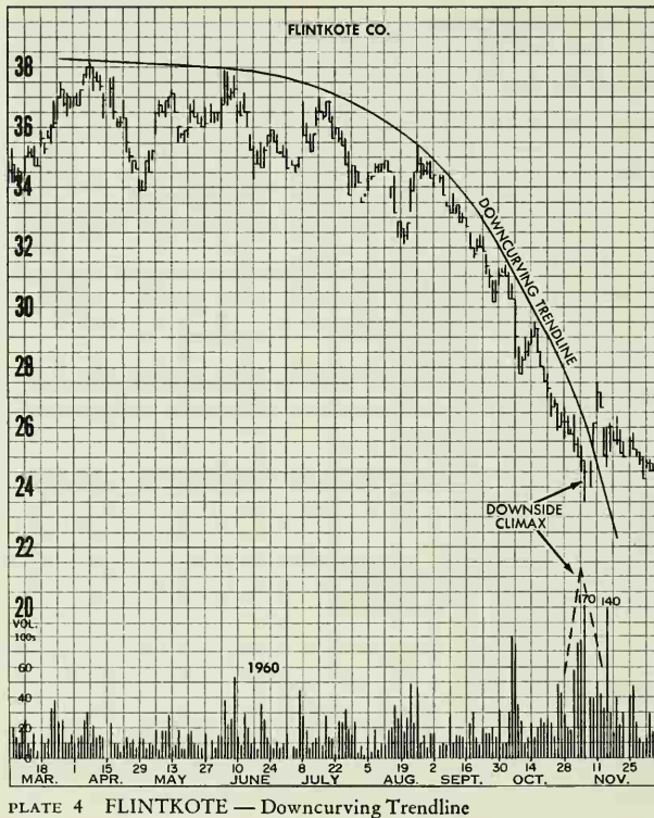 The curving downtrend line starts off the same way as the uptrend variety. There is a very gradual curving along the top of the formation and this becomes steeper as the move progresses. As in the chart above, volume remains relatively stable until the decline is well under way and then begins to pick up as the climax stage is reached. The upcurving trendline on the Korvette chart (plate 3) climaxed with very sharp moves but not unusually high volume. In Flintkote, the climax occurred on exceptionally high volume, but day-to-day price moves were not unusual. Climaxes are marked by either wide price moves or exceptional volume or both.