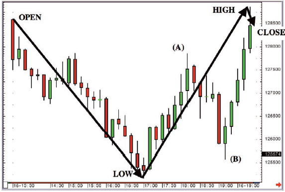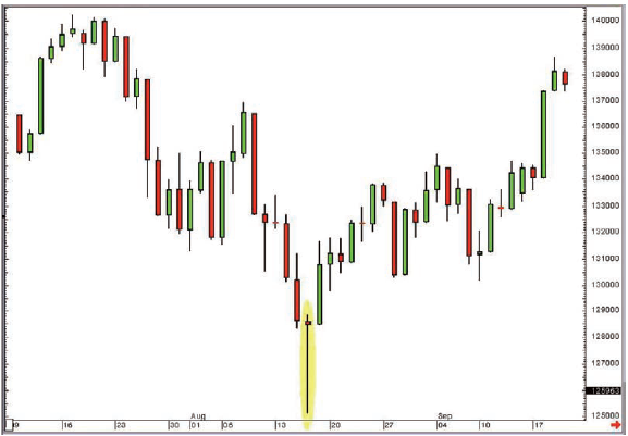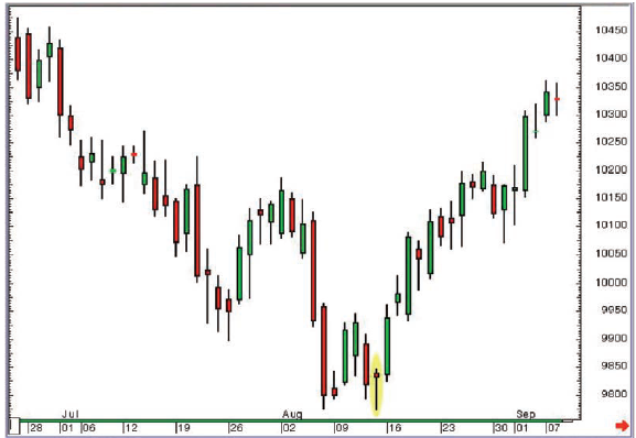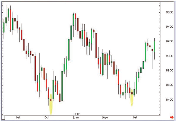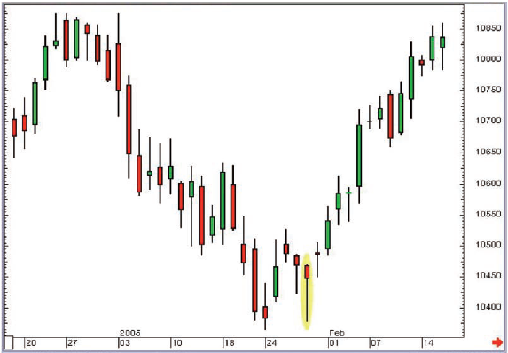 the Hammer pattern in Figure 3-5 didn’t actually define the low of the move,